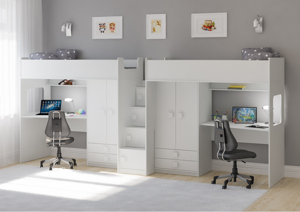 Две кровати, два шкафа, две игровых зоны – одна лестница. Идеальный вариант для двоих детей!